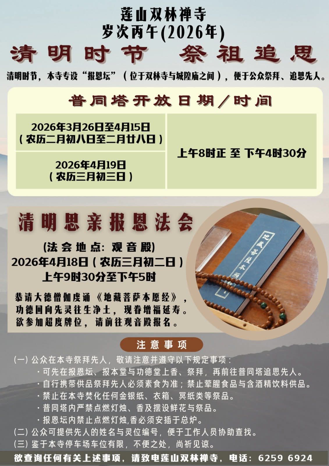For more information, please contact us today at 6259 6924 or email [email protected]. Alternatively, you can send us a cheque, paying to “Lian Shan Shuang Lin Monastery” together with your name, address and contact number behind the cheque. As for cash donation, please visit the Guan Yin Dian from 9am to 5pm.