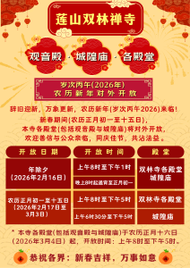 慈悲喜舍 法音流布 双林寺庆贺观世音菩萨圣诞法会 顶礼《大悲宝忏》 日期:农历岁次丙午二月十九日 (2026年4月6日,星期一) 时间:上午10时 地点:观音殿